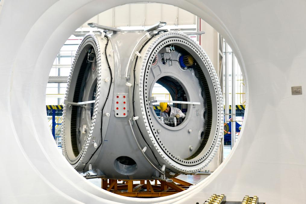 2月22日,在三一重能(日照)风电设备制造有限公司,工作人员在风电设备生产车间忙碌。新华社记者郭绪雷摄